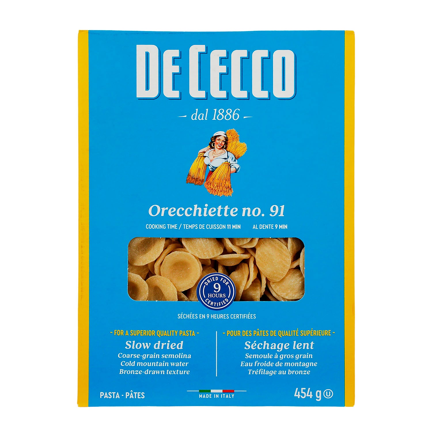 Pasta italiana típica de Puglia con forma de disco ligeramente ahuecado (“orejitas”), perfecta para retener salsas y acompañar verduras o preparaciones reconfortantes. Elaborada por De Cecco, casa con tradición desde 1886, esta orecchiette ofrece una textura consistente y el carácter clásico de la pasta de trigo duro.
